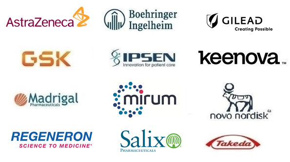 Boehringer-Ingelheim, CymaBay Therapeutics, Gilead, GSK, Ipsen, Intercept Pharmaceuticals, Madrigal Pharmaceuticals, Mallinckrodt, Merck, NovoNordisk, Salix, and Takeda.